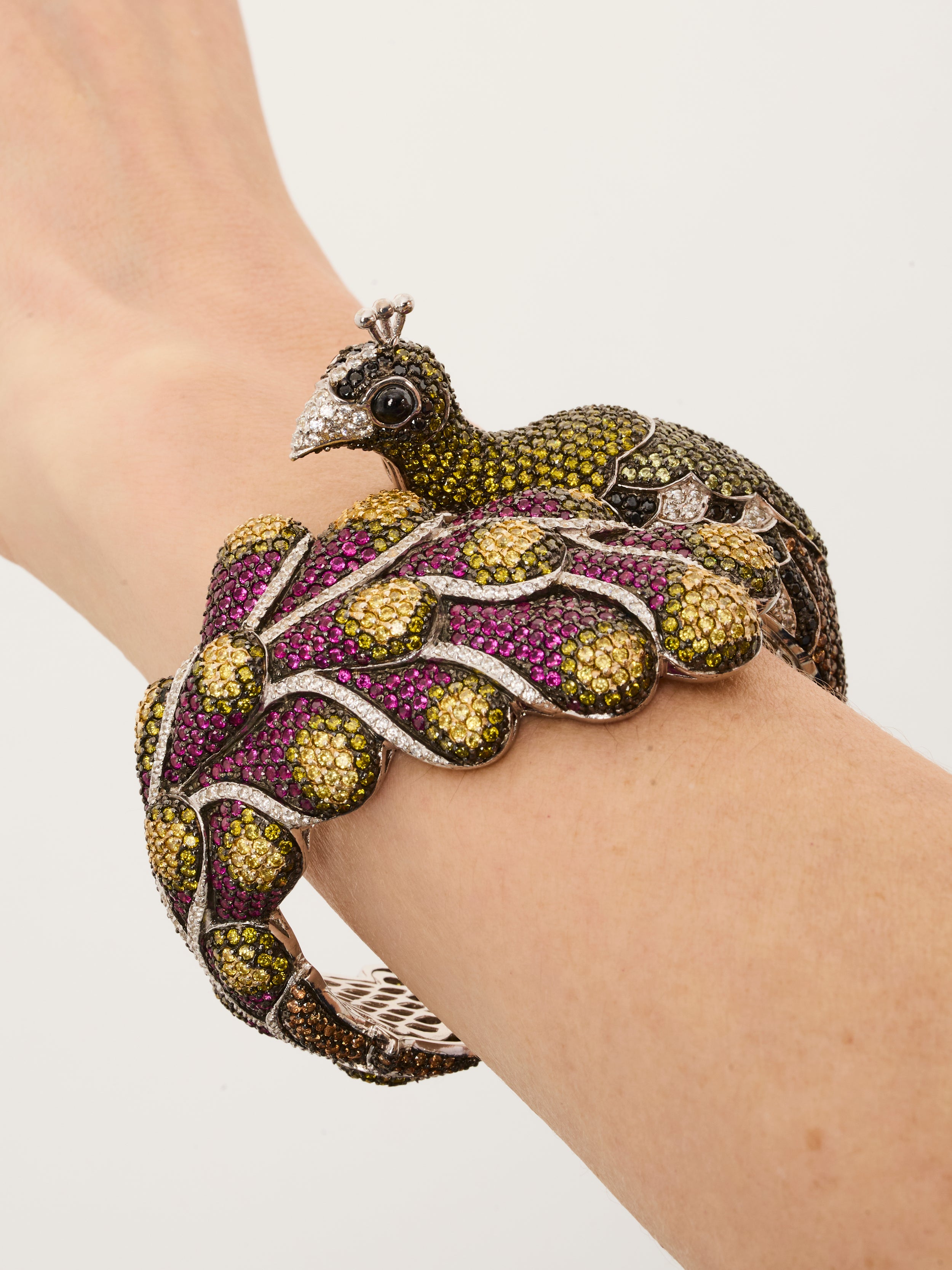 1qty NEW / Argent Rhodié Bracelet rigide Paon sur argent rhodié pavage burmalite™ multicolore // RECO : 594€