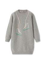 Ravissant cardigan en laine mérinos extra fine de couleur gris clair, dont le devant est décoré d'une broderie faite à la main représentant deux patins, reliés par un nœud rose qui s'entrelace.