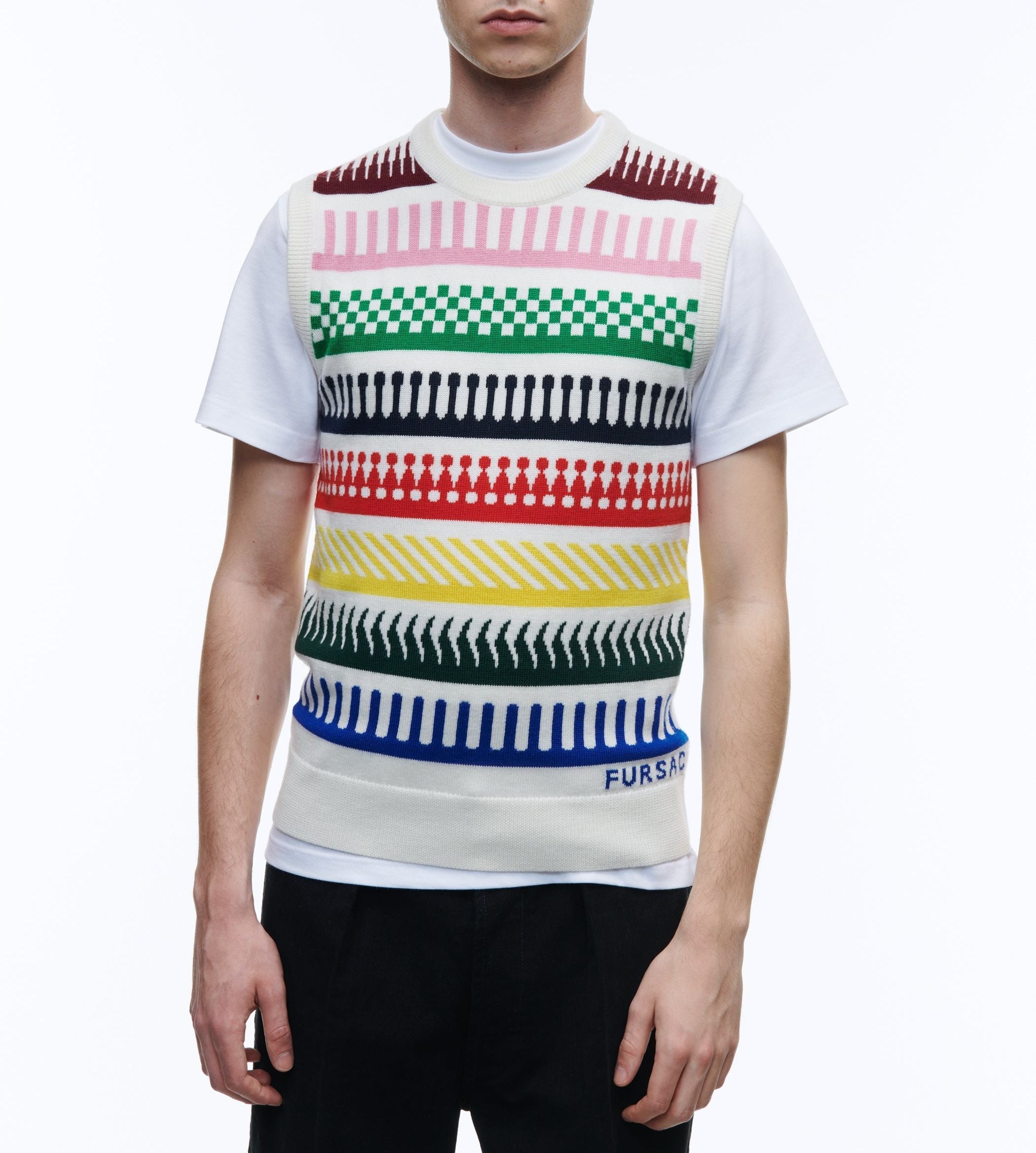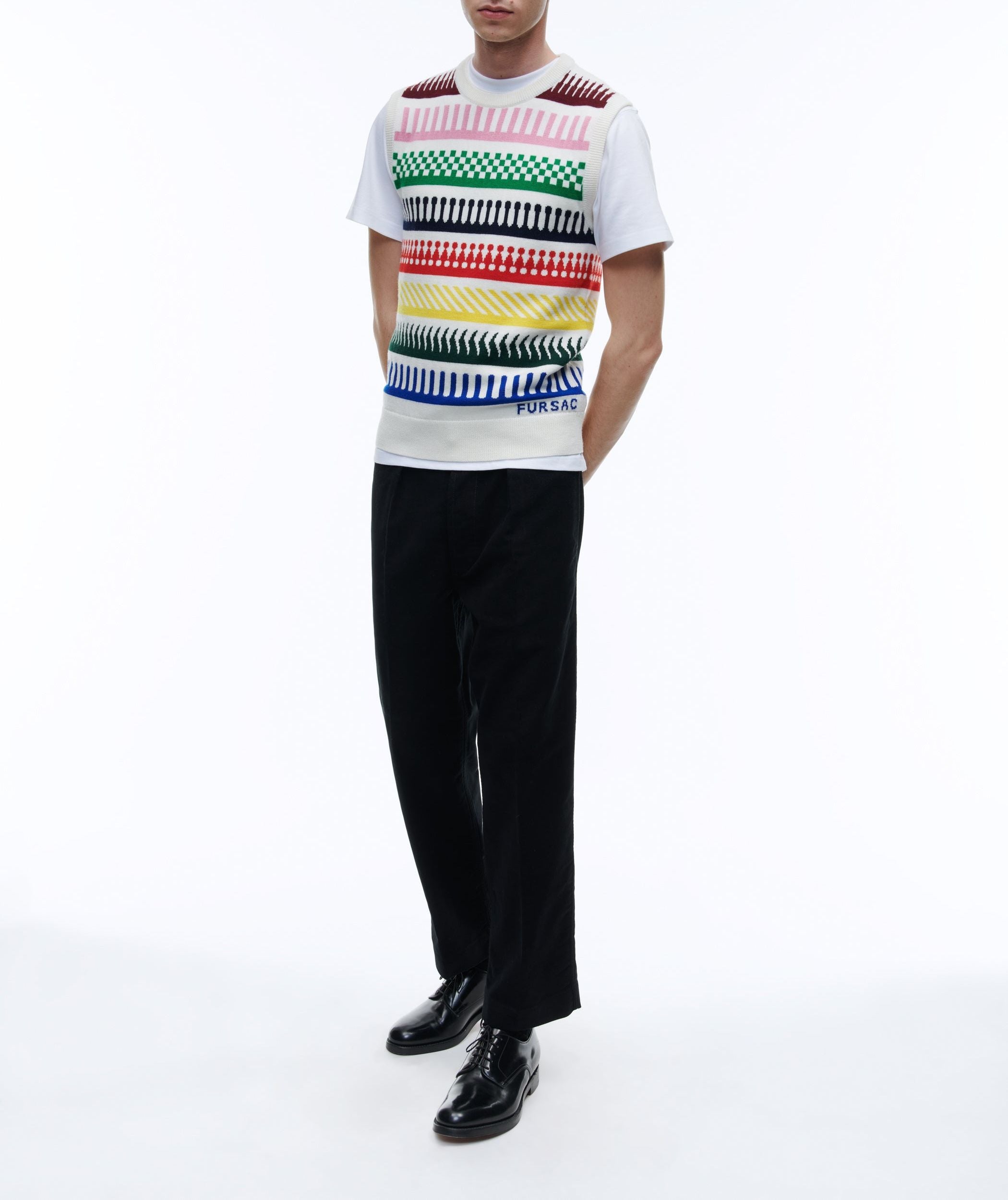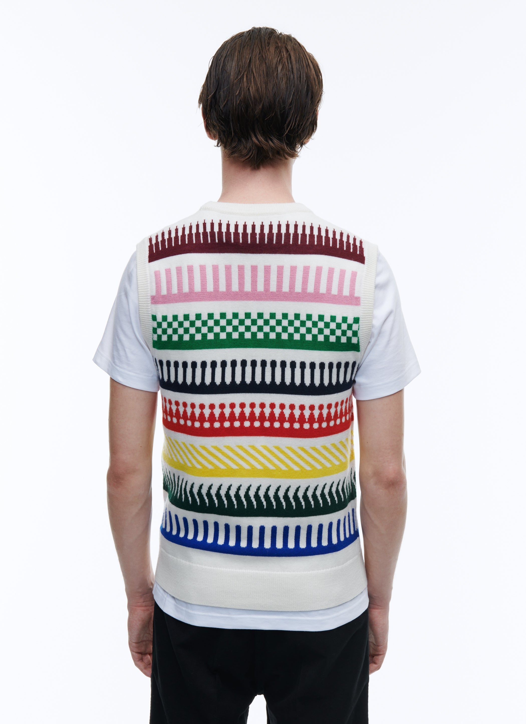 Pull en laine mérinos à motif fantaisie multicolore.