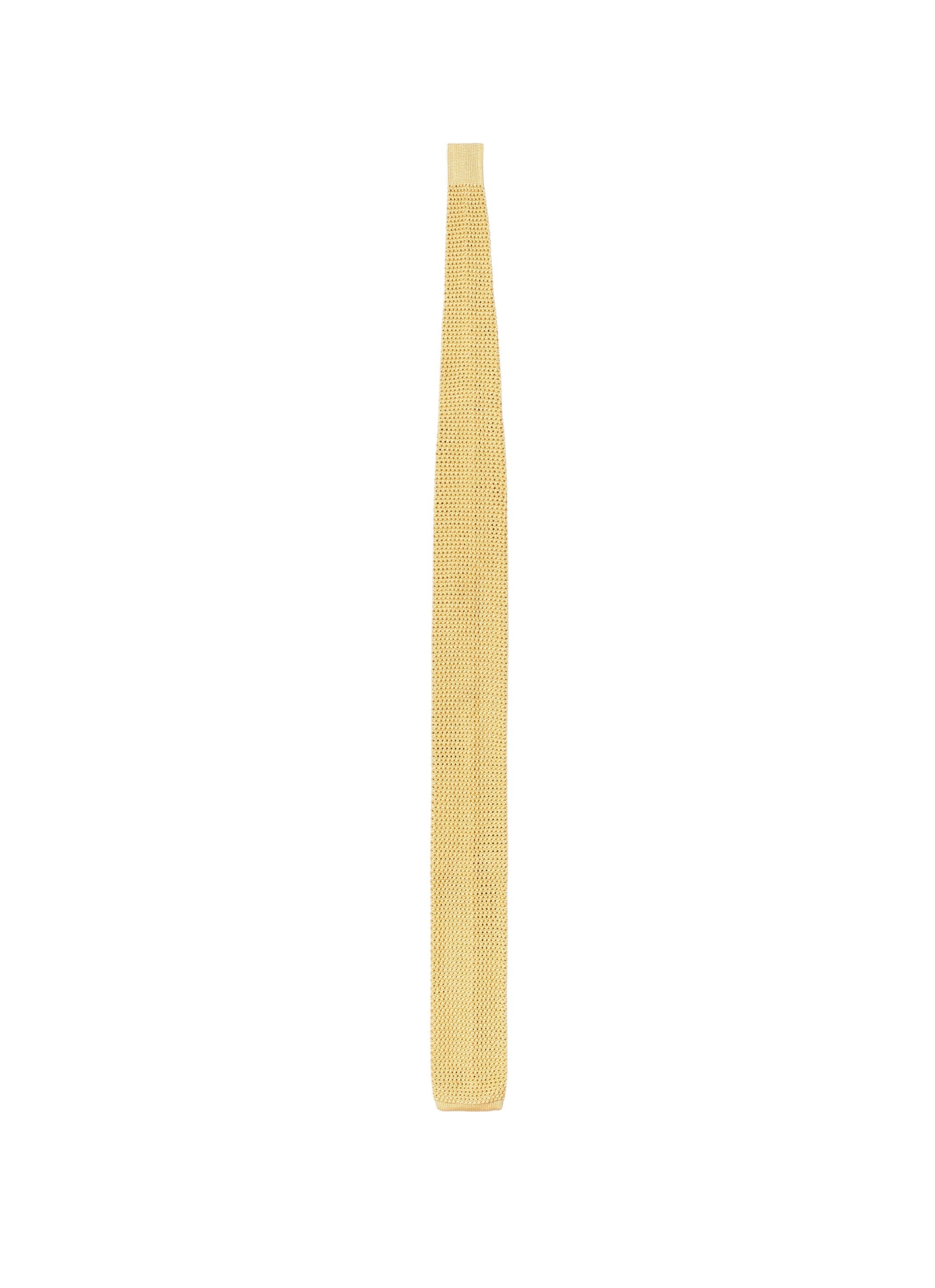 Cravate jaune pâle en tricot de soie et bas fini droit.