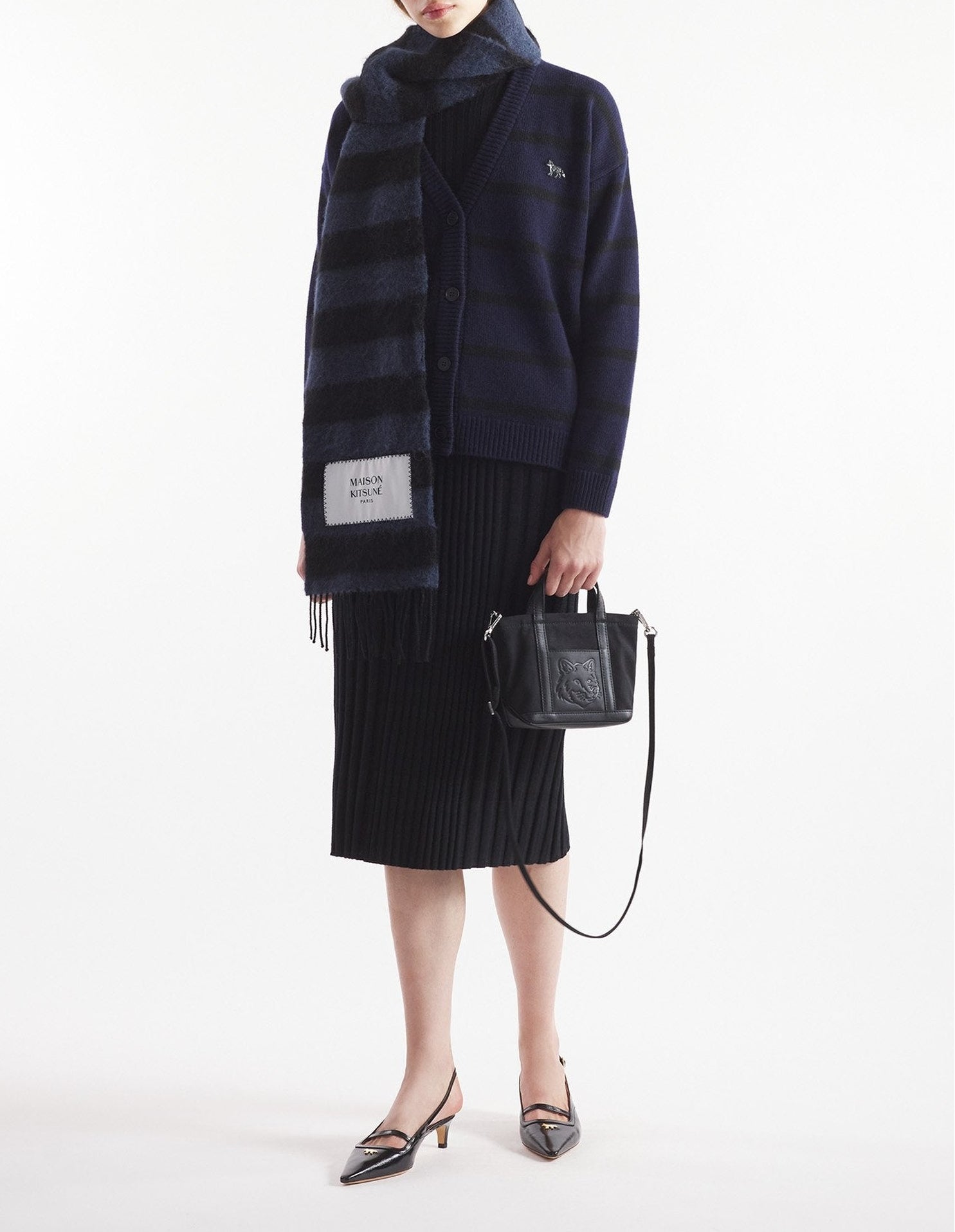 Cardigan en maille rayée à manches longues avec broderie Profile Fox en perles sur la poitrine.
