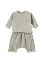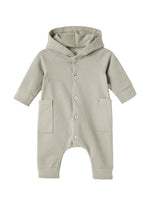 Pyjama avec pieds en molleton de coton biologique gaufré gris avec un visage de chat appliqué sur le devant.