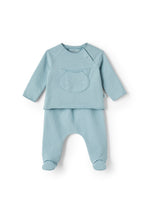 Pyjama, vaporeuse et côtelée en coton biologique, de couleur bleu papier sucre, avec encolure séraphique, manches raglan, ouverture à boutons en coton sur tout le devant et petite poche sur le côté.