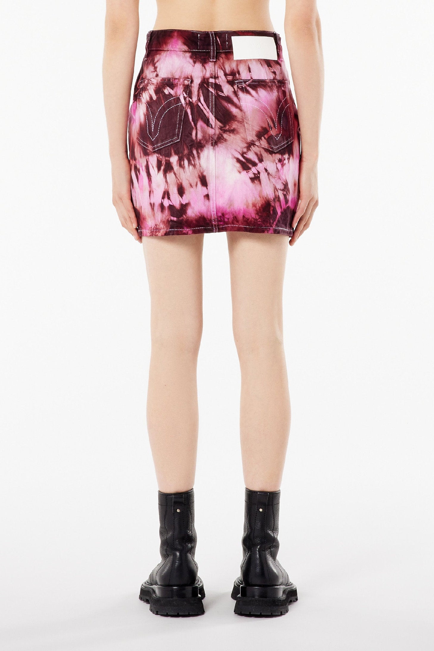 Jupe courte en denim délavé tie and dye rose.
