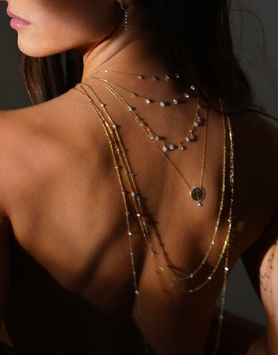 Amoureuse de sa pureté, Nawal Laoui met le diamant en lumière. C’est au Japon que la jeune entrepreneuse s’initie aux techniques locales qui percent le diamant pour le porter sur des chaînes si fines qu’il semble posé sur la peau. Inspirée par ses racines marocaines et son tour du monde, elle fonde Persée en 2017. Considérant le bijou comme un tatouage, Nawal Laoui imagine des créations épurées et sensuelles où l’or et les gemmes se marient avec légèreté et éclat.