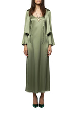 Adopt the timeless elegance of silk with this Tizia top. Featuring long, slightly trumpet sleeves and a V-neckline open at the front, this short silk blouse closes delicately with ties, adding a touch of femininity.