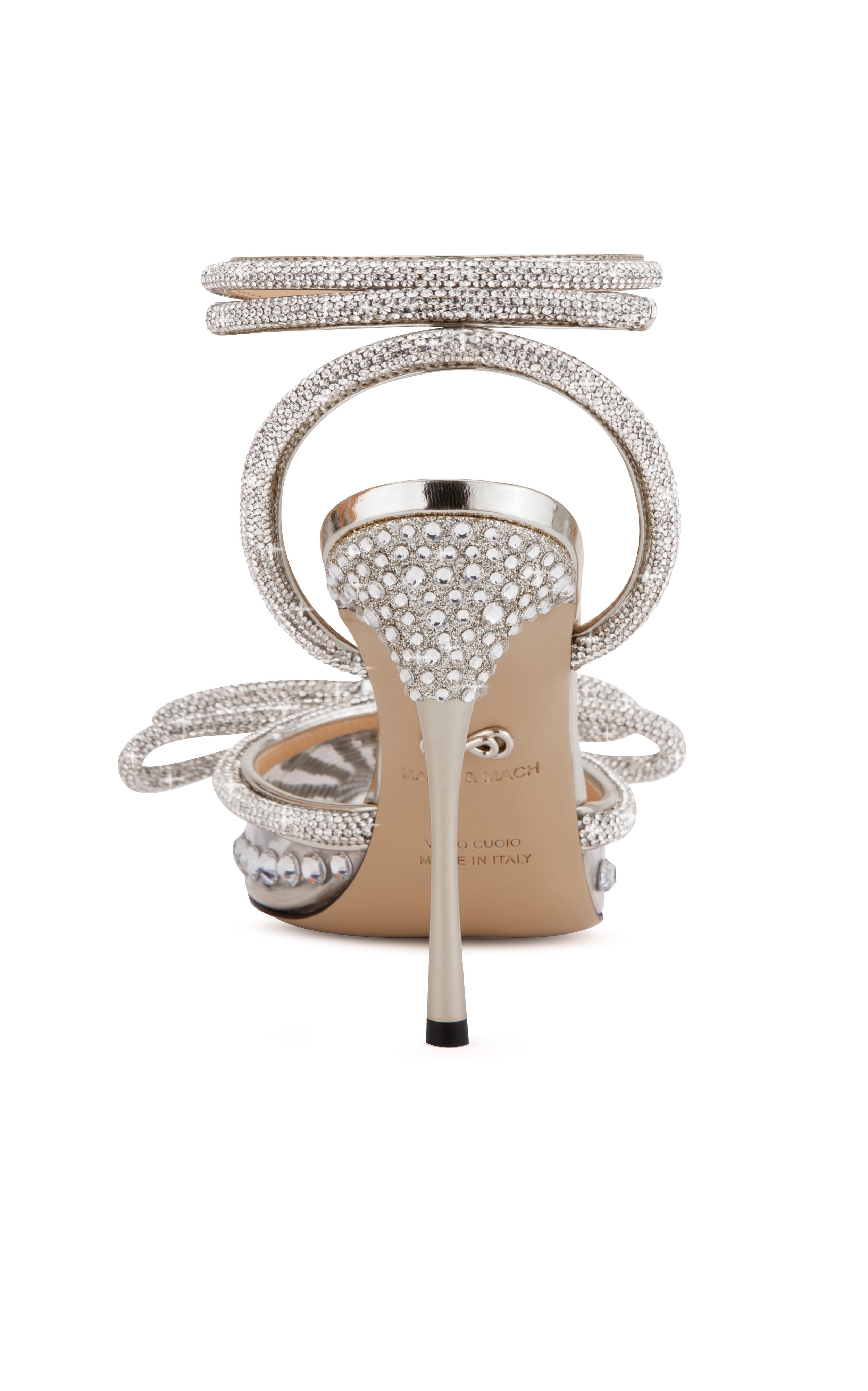 Double Bow strappy pumps adorned with rhinestones with a heel height of 9.5 cm, made in Italy.