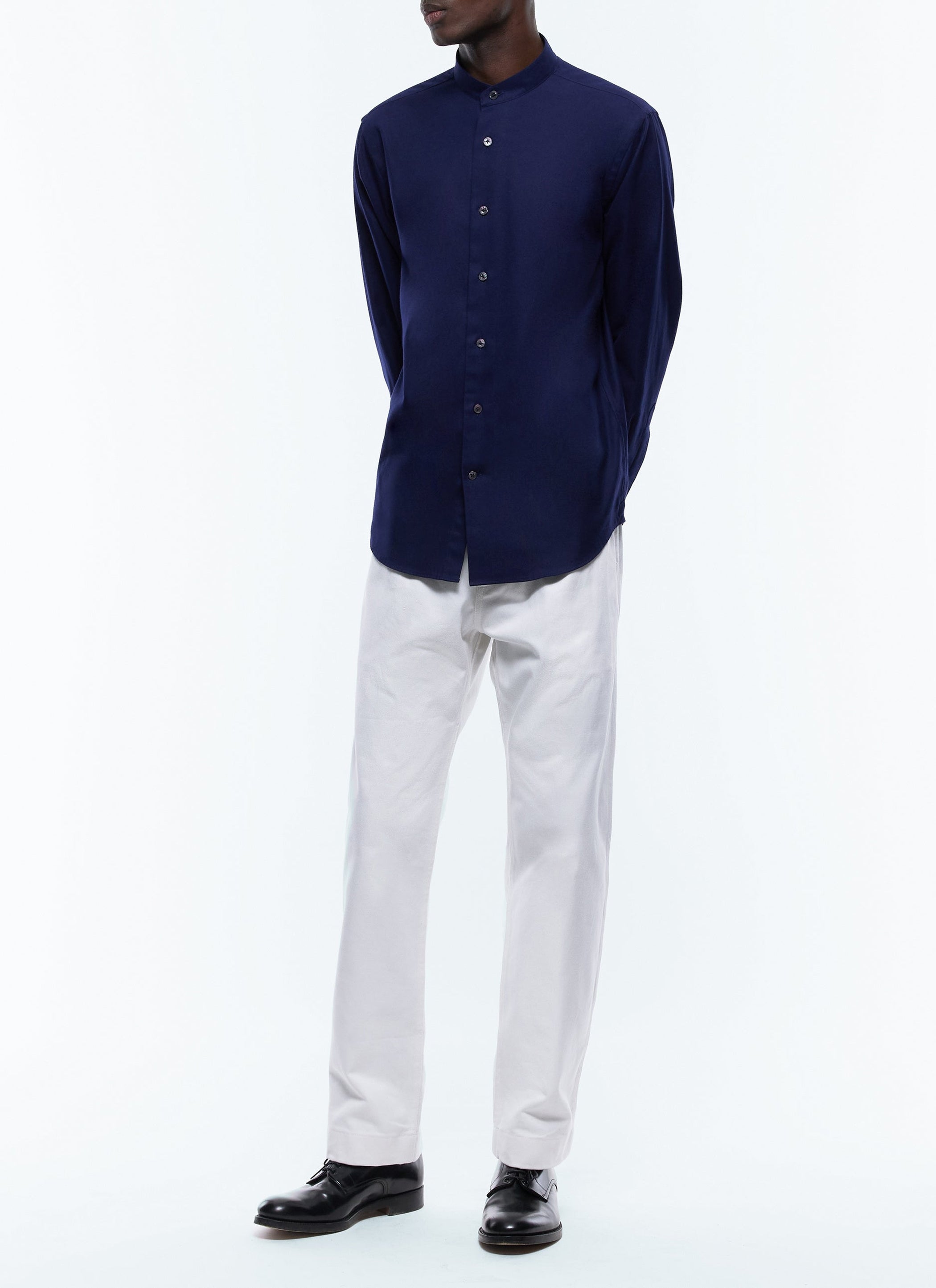 Grandfather collar shirt in brushed cotton.
