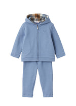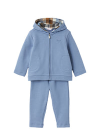 Two-piece set in mid-weight cotton fleece material, baby blue, consisting of a zip-up hoodie and matching tracksuit trousers with elasticated waistband.