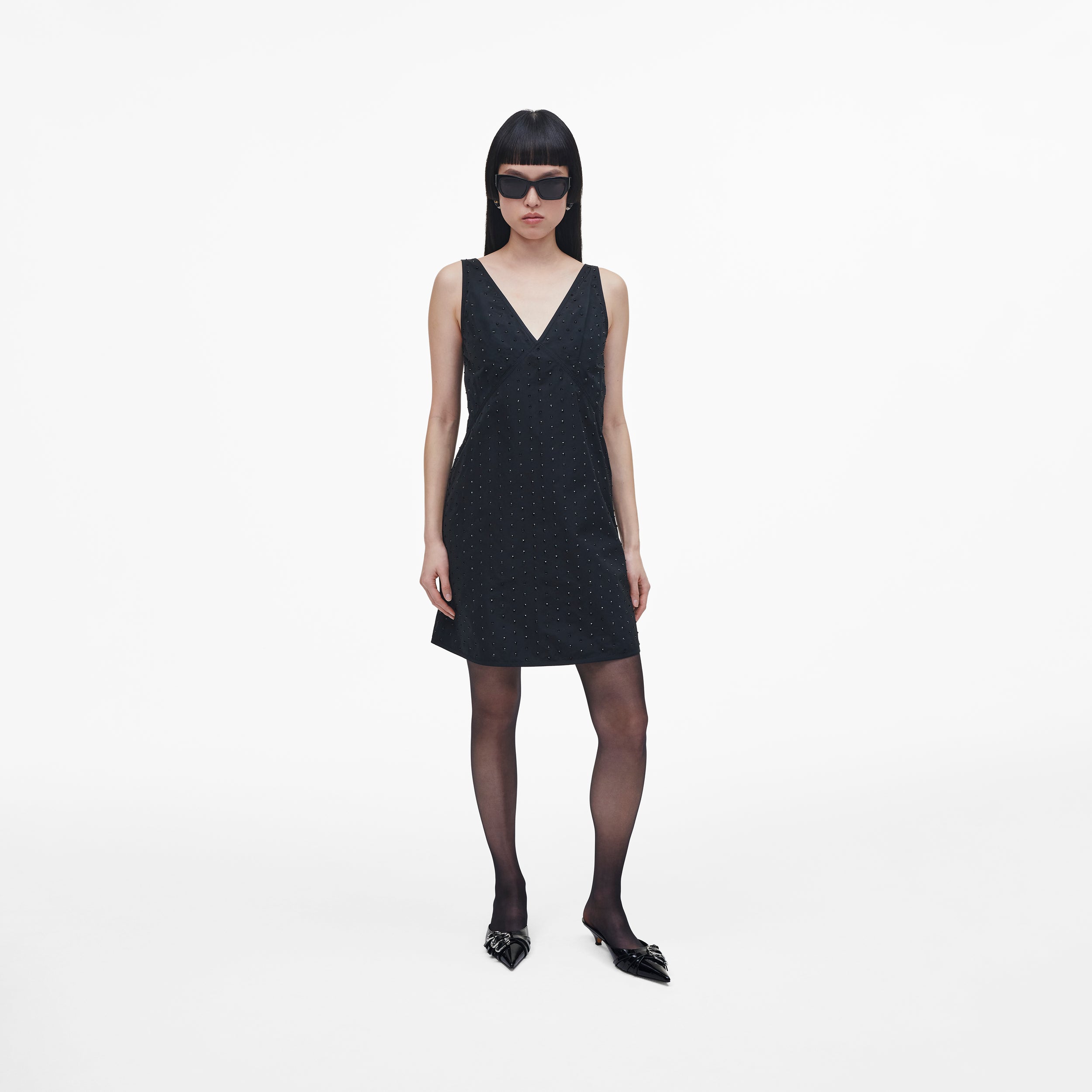 Inspirée des créations d'archives des défilés et des muses de Marc, cette robe ample à coupe trapèze est confectionnée en taffetas japonais et ornée de cristaux noirs ton sur ton.