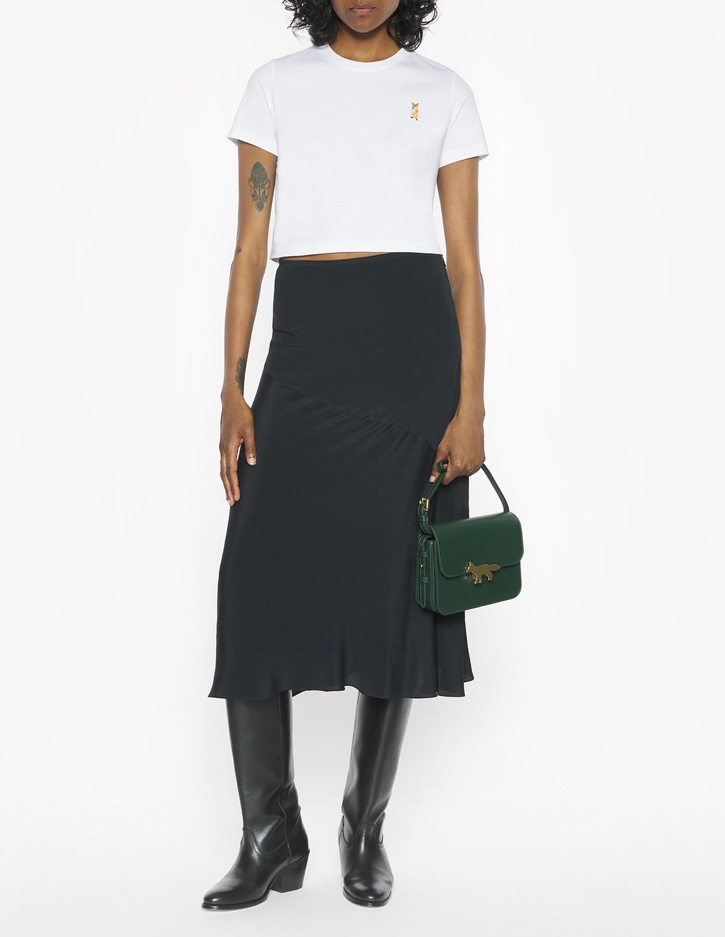 Cotton jersey cropped tee with embroidered Lady Fox patch.