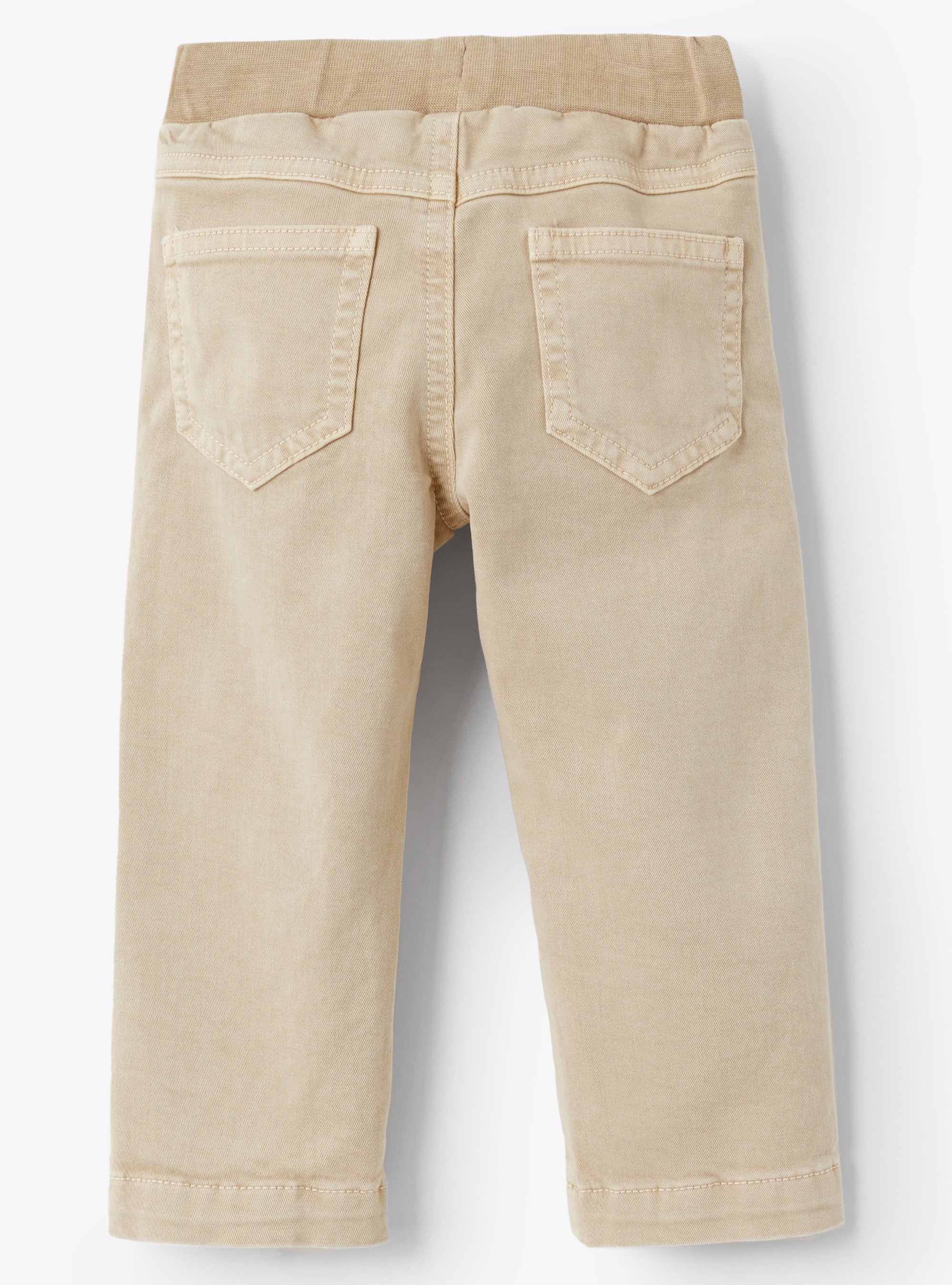Comfortable light beige cotton trousers with soft elastic waistband and matching drawstring.