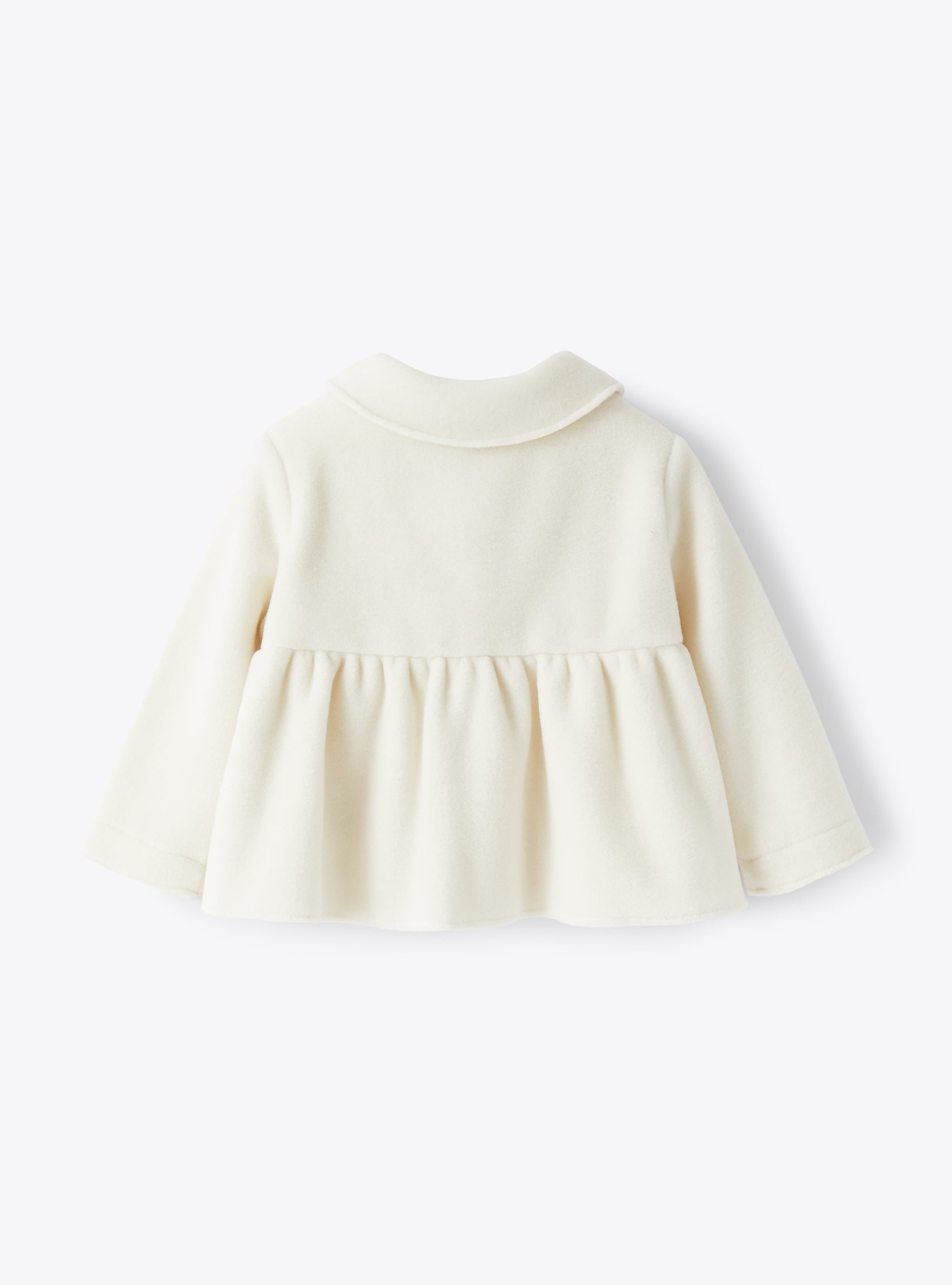 Soft, warm milky-white fleece jacket with small round collar and comfortable button placket covered with tone-on-tone buttons.