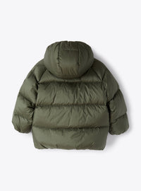 Comfortable down waterproof jacket in green with fixed hood and natural-coloured bouclette lining.