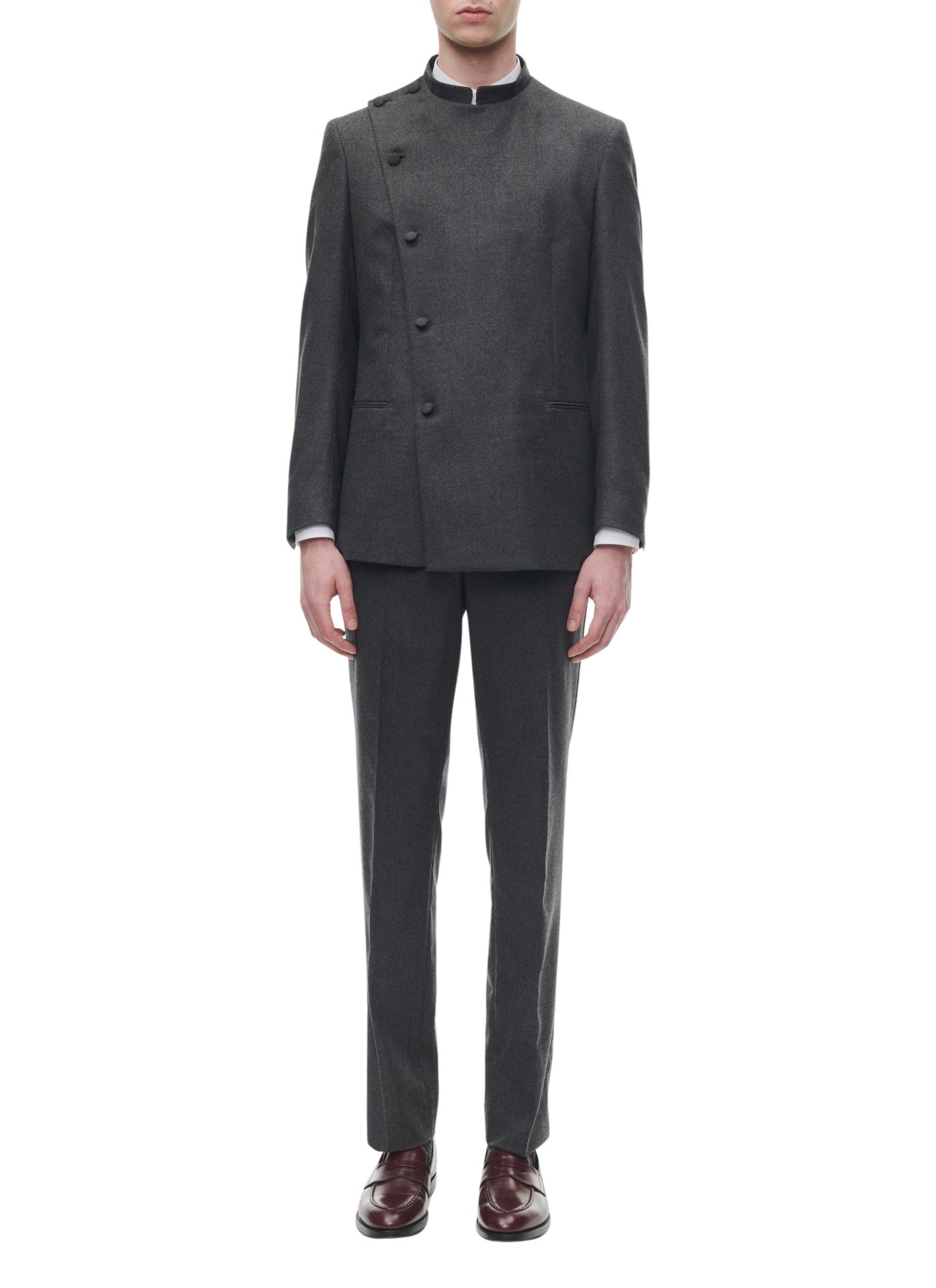 Wool double-breasted suit with officer's collar.