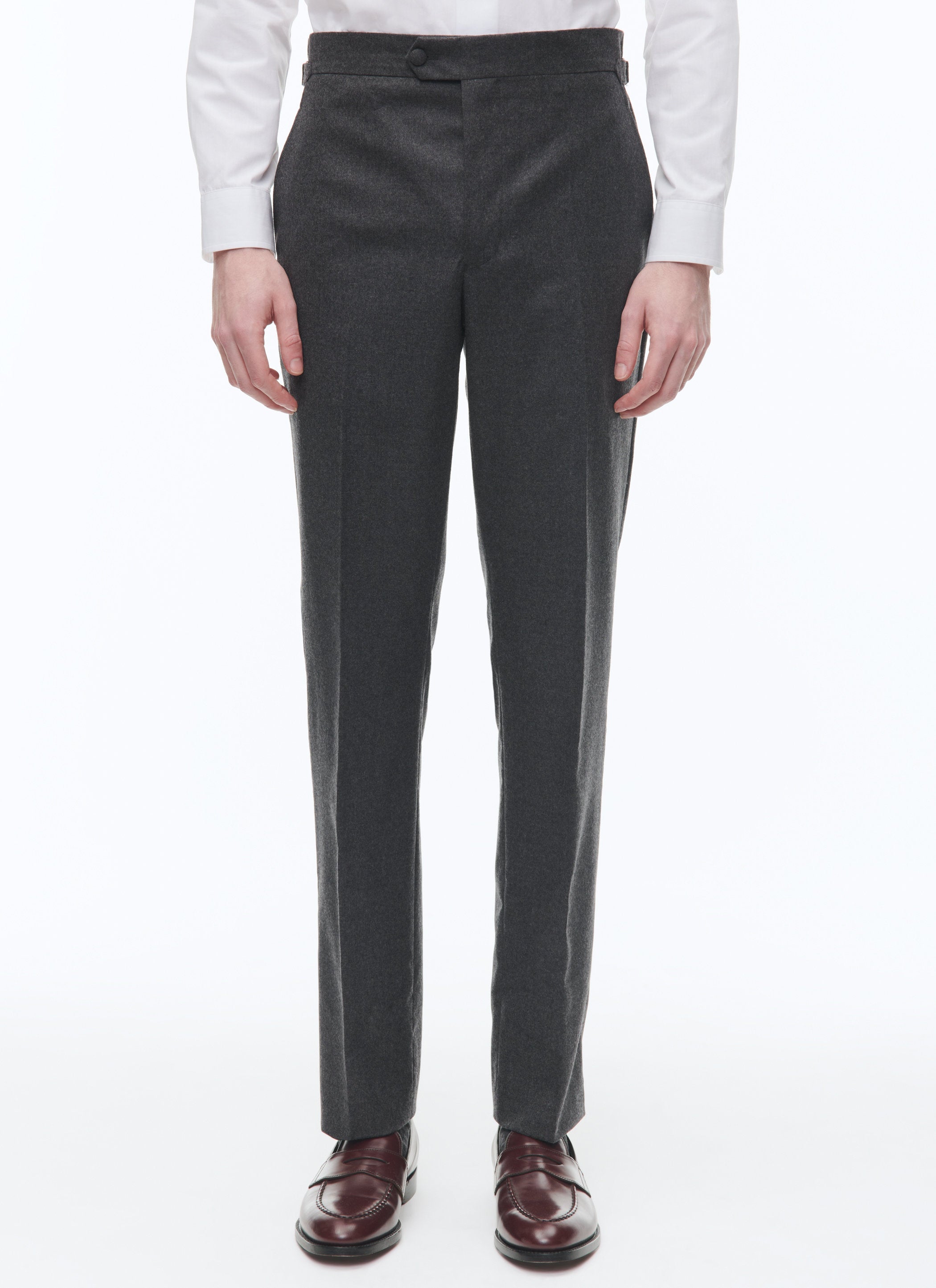 - Mid-rise trousers, fitted leg, unfinished bottom