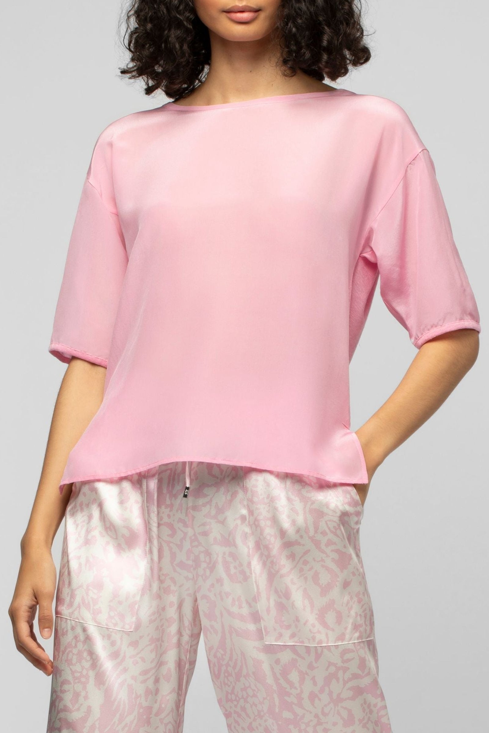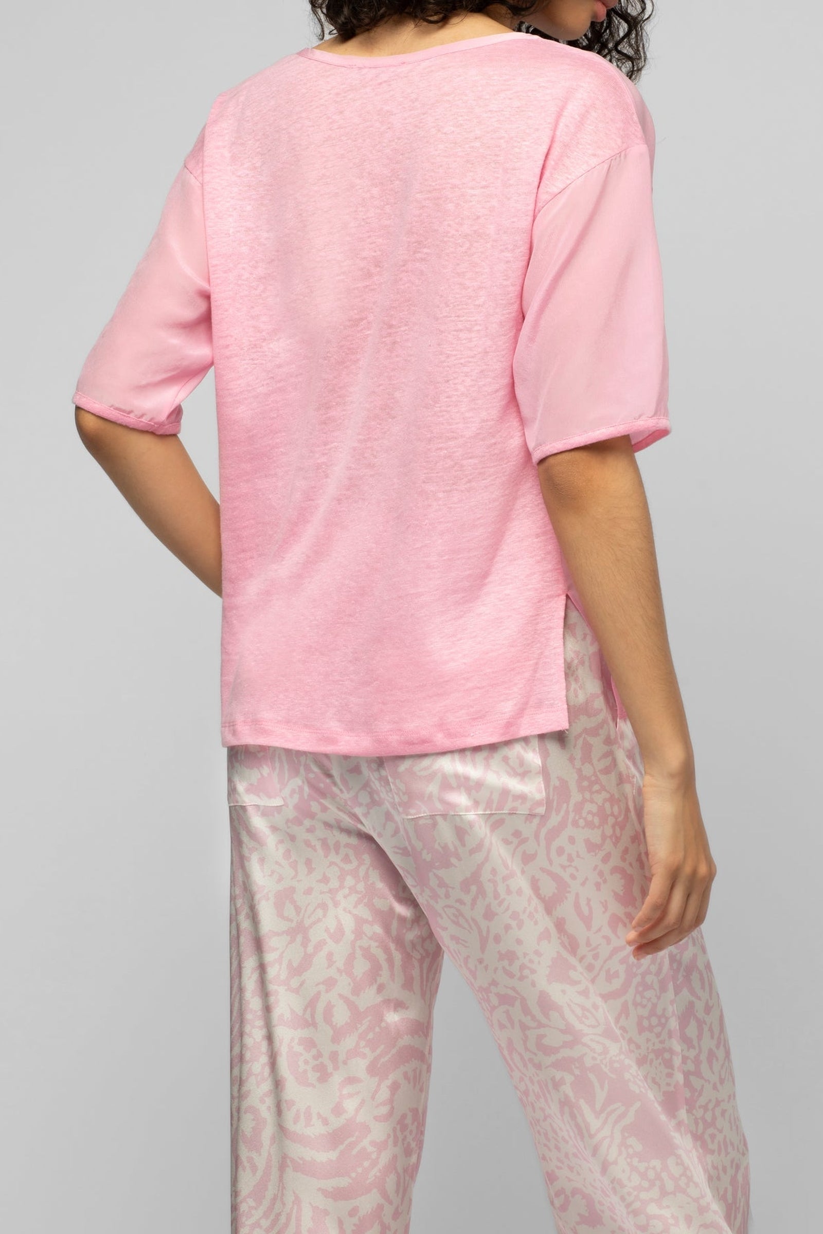 Notre t-shirt bi-matière en lin et soie Tarleen présente une coupe ample, des manches courtes, un large col rond et de délicates fentes sur les côtés.